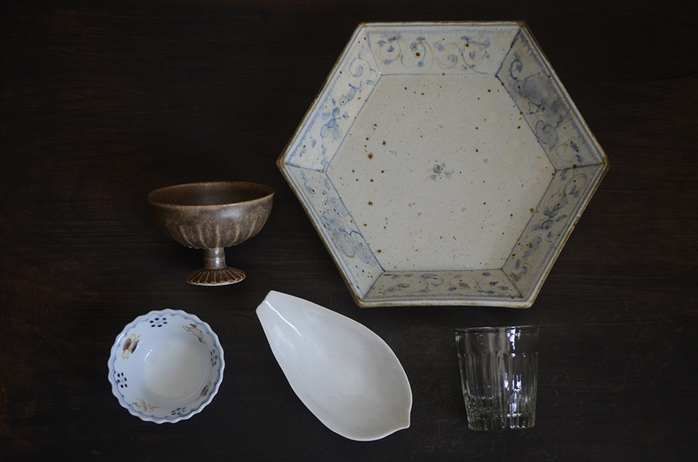 丸いウツワの多い食卓に、足すと楽しい器が並びます。