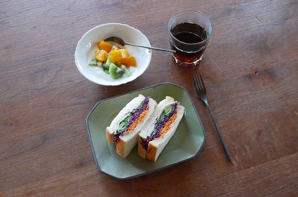 丸いウツワの多い食卓に、足すと楽しい器が並びます。