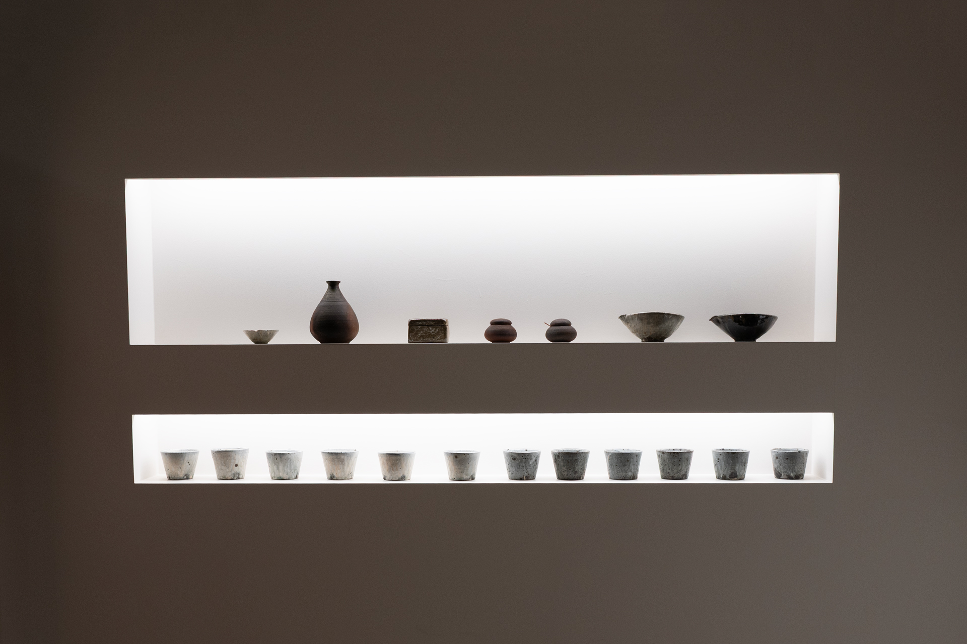 This exhibition also features works fired in a wood-burning kiln, a process she has been exploring in recent years.