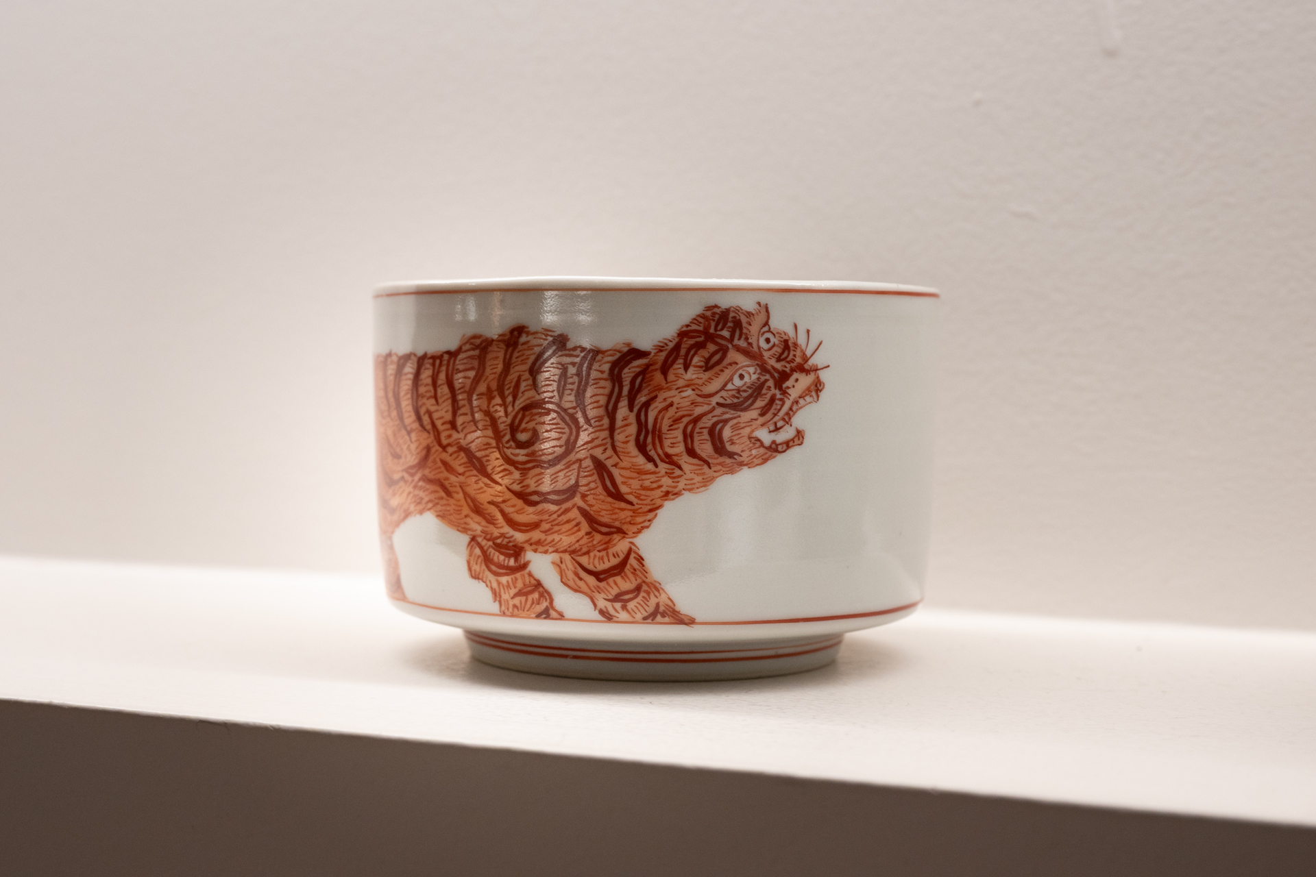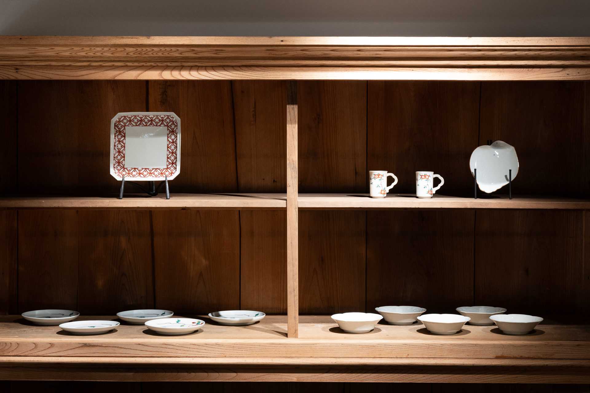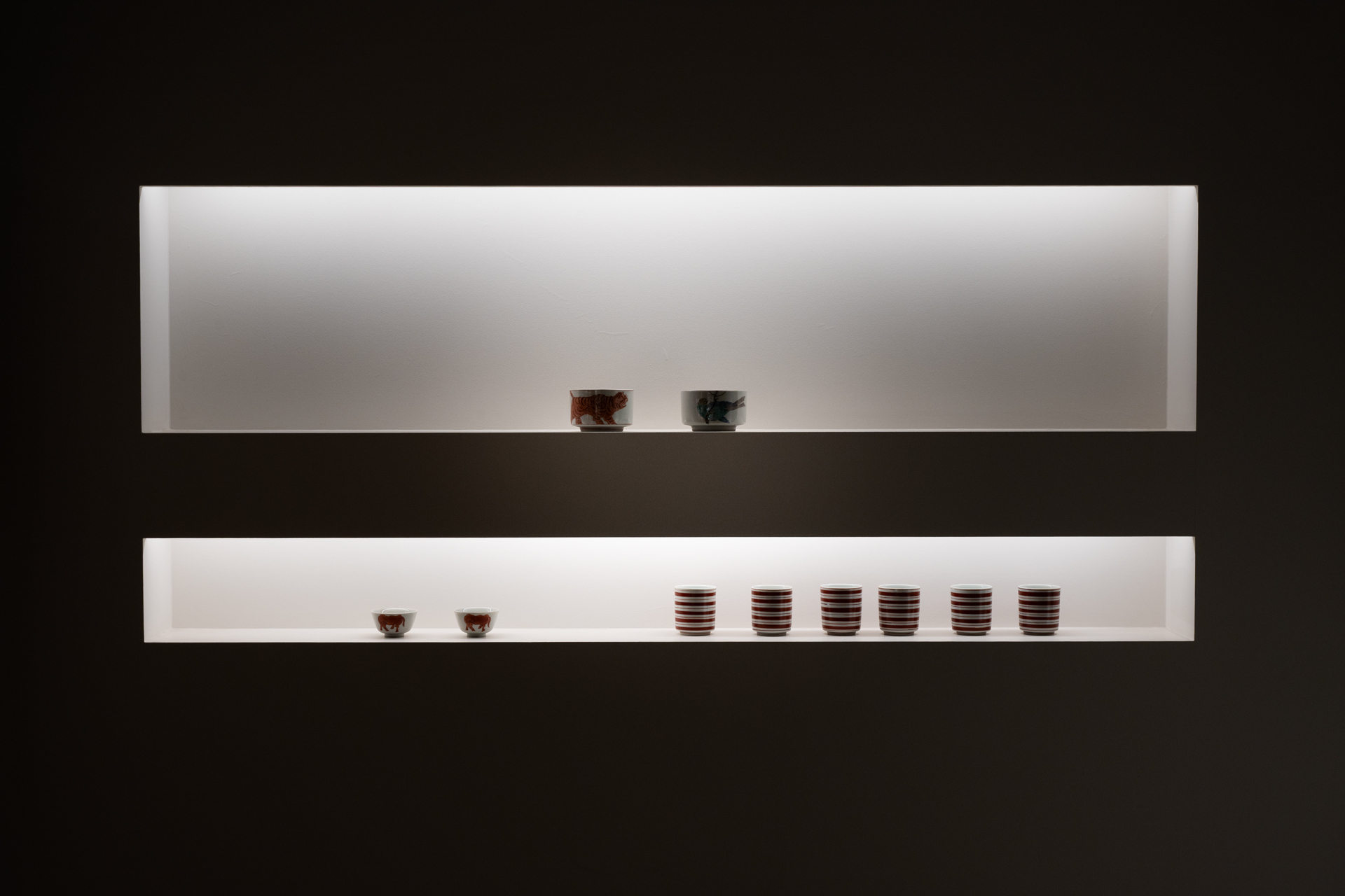 エッジの効いた輪郭と、余白と緻密な筆で描かれた絵付けの器たちは、