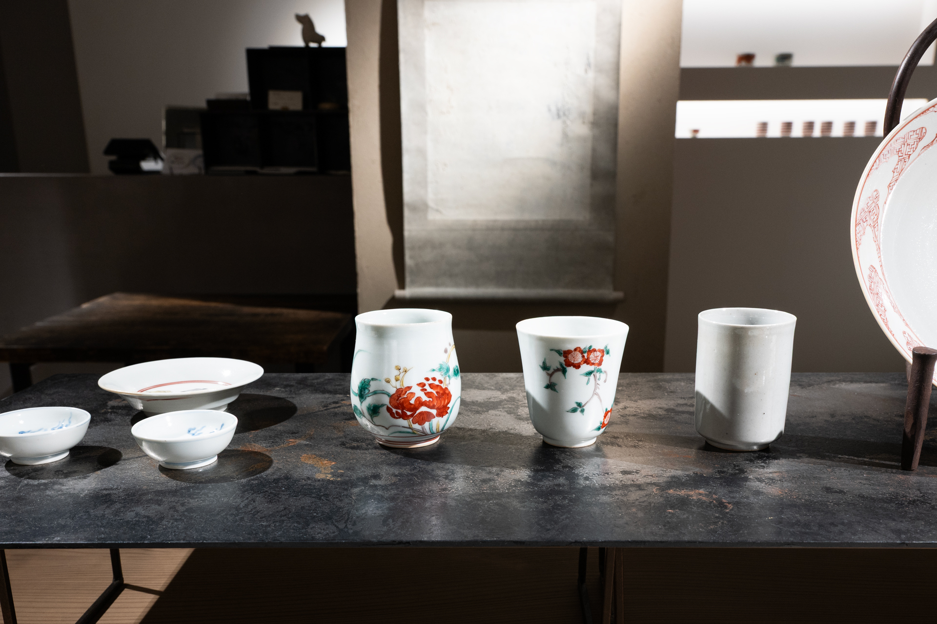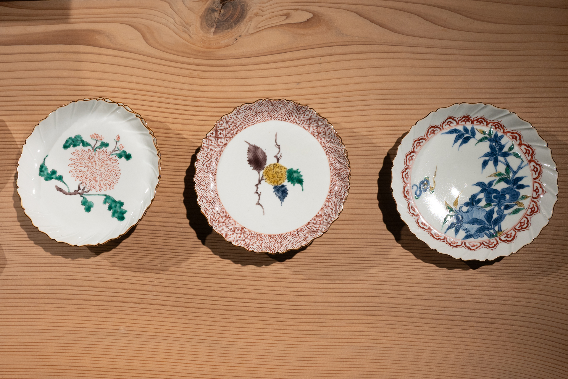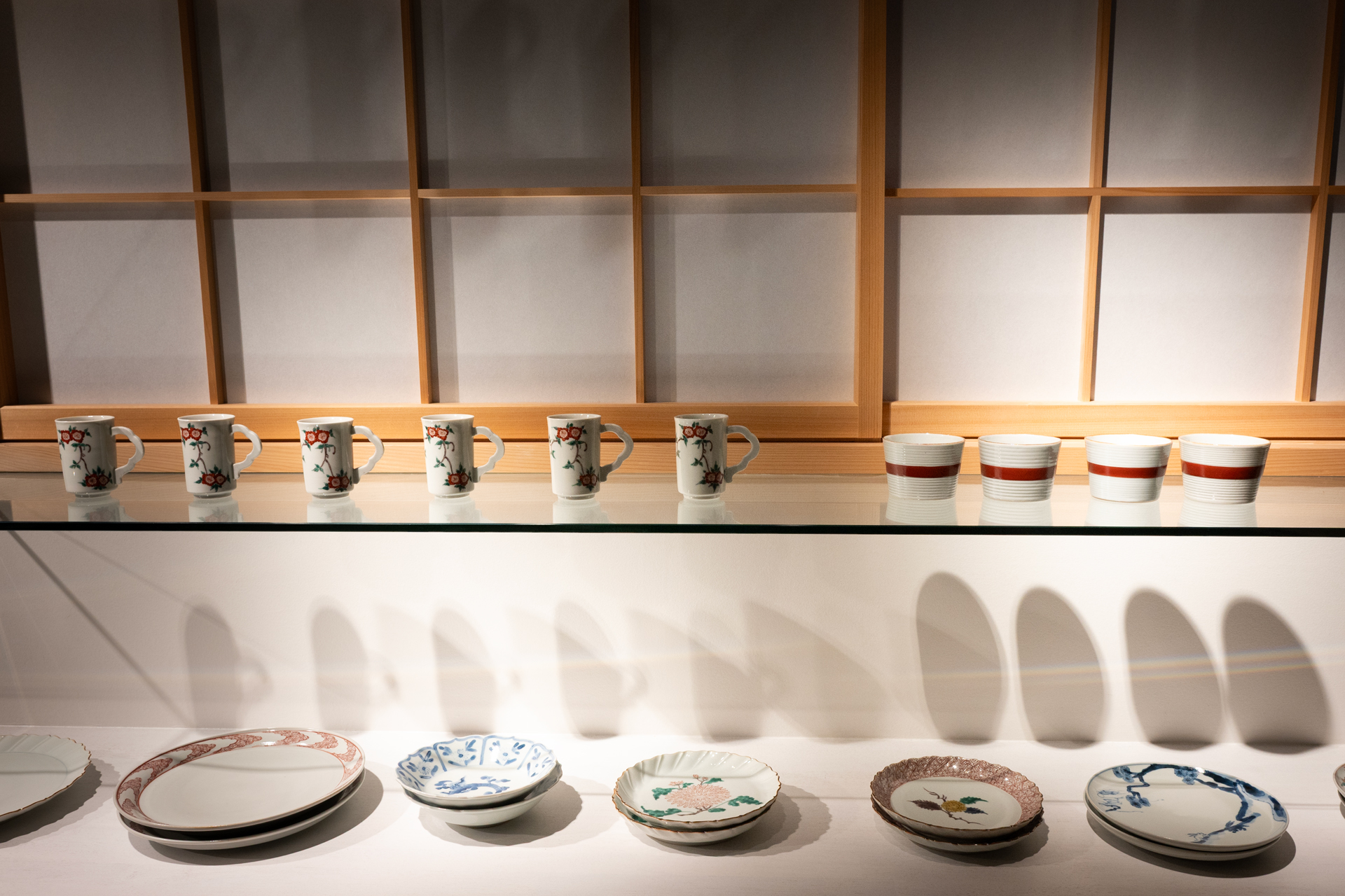 エッジの効いた輪郭と、余白と緻密な筆で描かれた絵付けの器たちは、