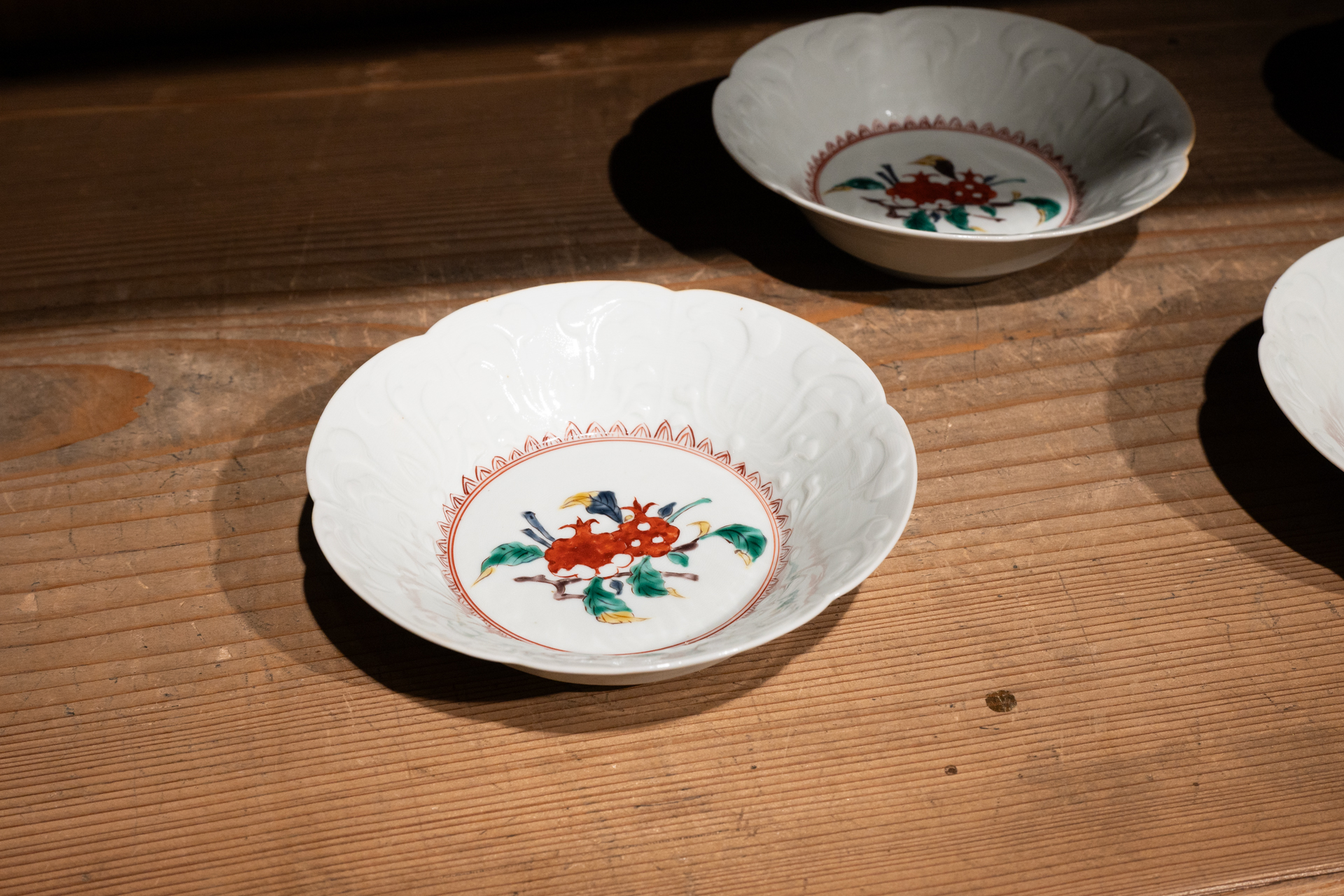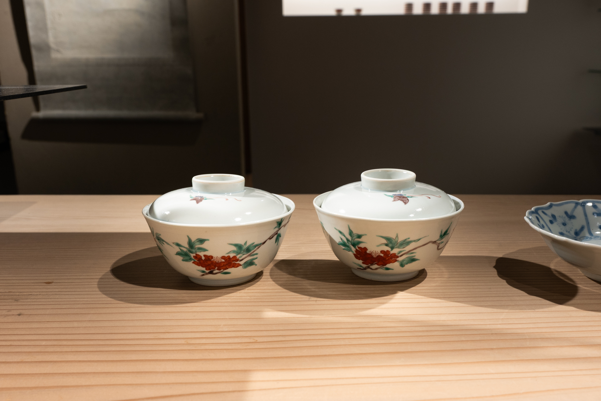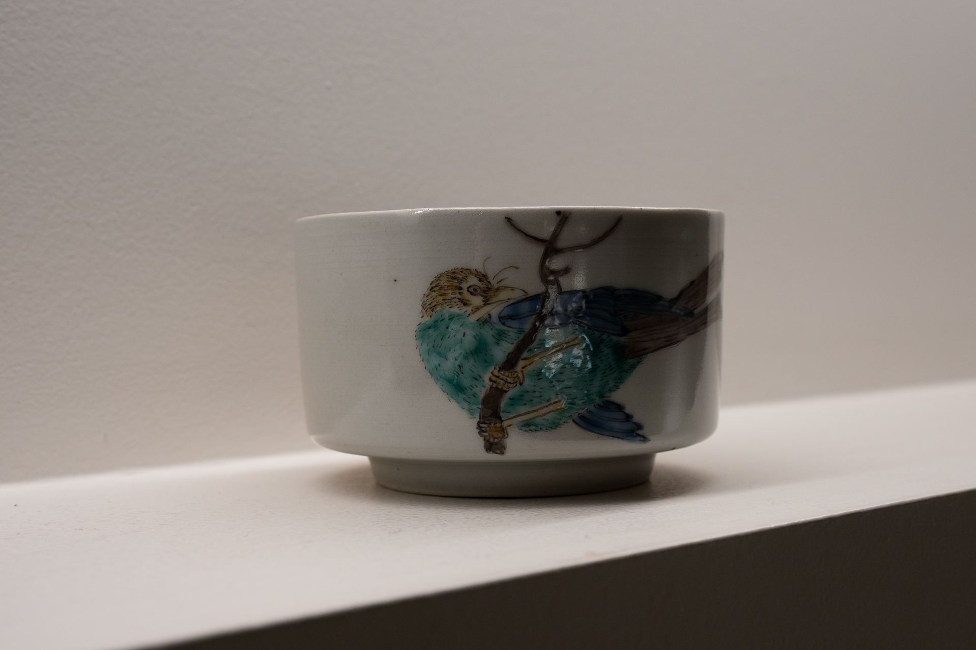 少し濁りを含む磁器肌に、細密な筆致で重ねられた染付・上絵は、